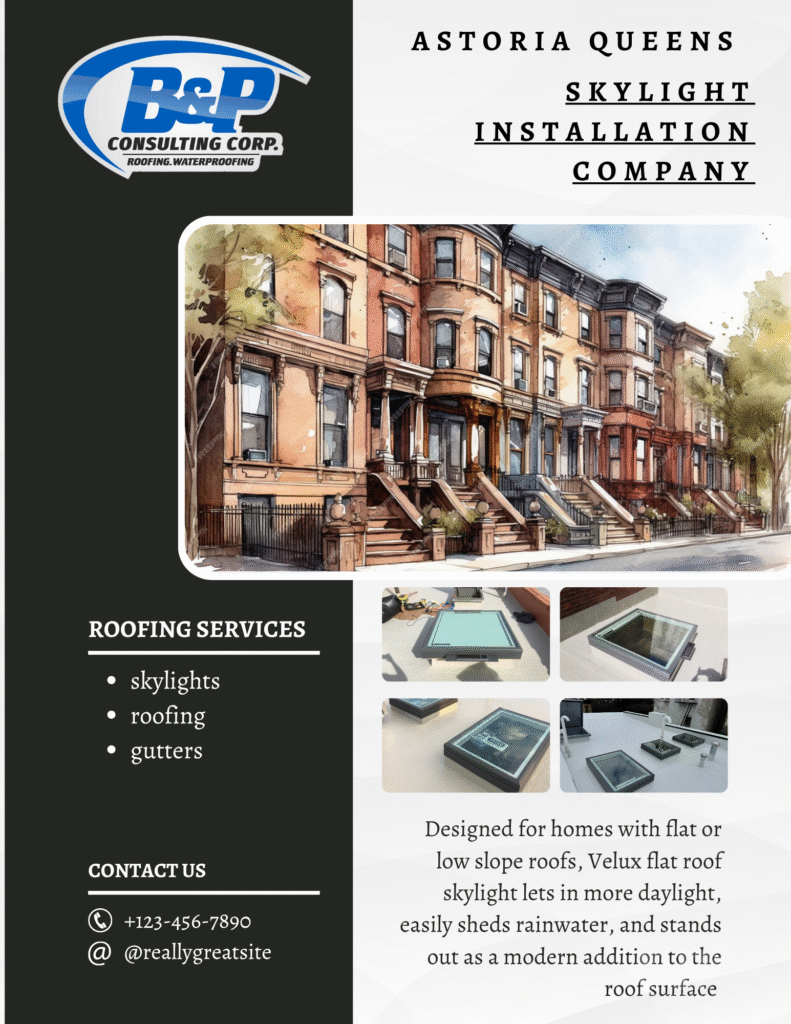 In Astoria, where artistic culture meets modern livingflat roof skylights can transform your space with natural light and energy efficiency. At B&P Consulting Corp., we specialize in flat roof skylight installation, repair, and replacement, offering customized solutions for your home or business. Whether you’re installing a new skylight to brighten your living room, repairing a leaking skylight, or replacing an old one, our expert team ensures that your skylight adds both beauty and functionality to your property in Astoria.