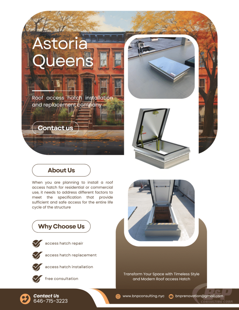 When it comes to maximizing your rooftop space in Astoria, having convenient access is key. B&P Consulting Corp. offers roof access hatch installation for residential and commercial properties in Astoria, Queens. Whether you’re looking to install a hatch for regular maintenance, emergency egress, or to create a rooftop garden, our team ensures a customized solution that’s secure, weather-resistant, and perfectly integrated into your property’s design.
