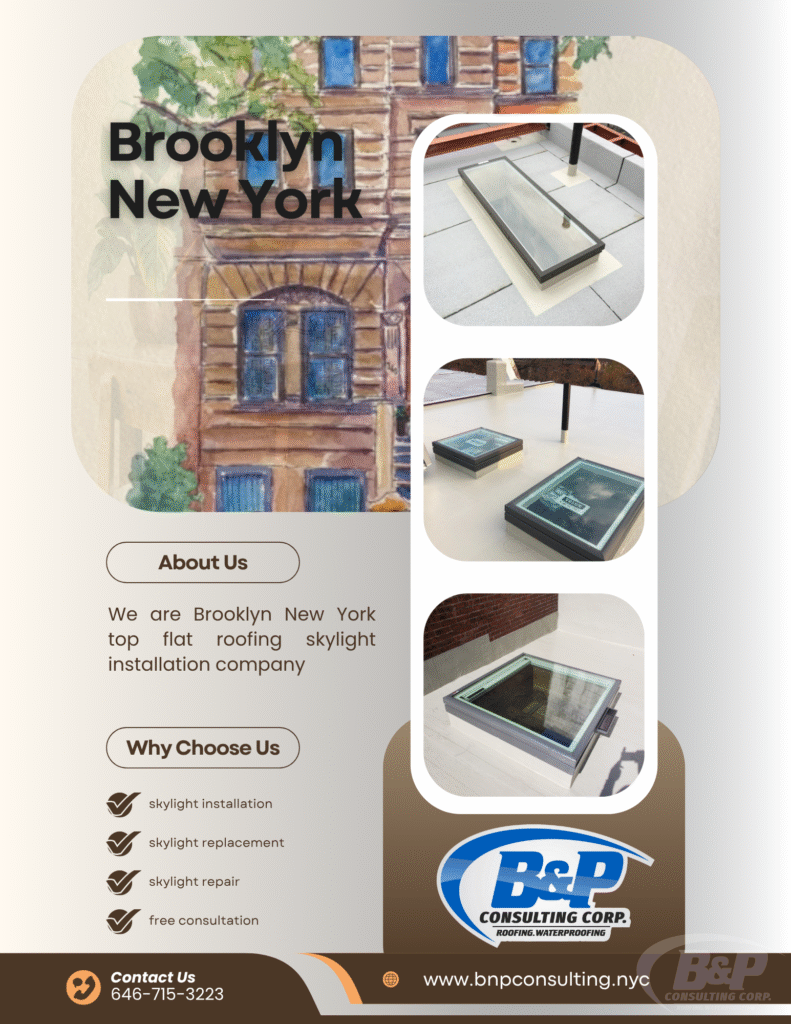 Bring natural light into your Brooklyn home or business with expert Flat Roof Skylight installation, repair, and replacement from B&P Consulting. Our team specializes in enhancing rooftops across Brooklyn, ensuring skylights are not only beautiful but also weatherproof and energy-efficient. Whether you’re installing a brand-new skylight, fixing leaks, or upgrading an outdated model, we provide seamless solutions built to withstand the city’s ever-changing climate. Trust B&P Consulting for high-quality craftsmanship and reliable service—because your skylight should shine as bright as your space!