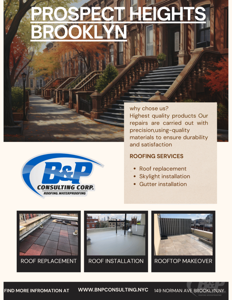 With its rich history, cultural landmarks, and beautiful brownstones, Prospect Heights, Brooklyn, is a neighborhood that blends classic charm with modern living. Once home to grand mansions in the 19th century, the area evolved into a thriving residential community, now known for its stunning pre-war buildings and proximity to Prospect Park. Many of these historic properties feature flat roofs that require expert maintenance to ensure longevity and durability. At B&P Consulting we specialize in roof replacementroof repair, and roof installation, providing high-quality, weather-resistant solutions tailored to Prospect Heights’ unique architecture. Using premium materials and expert craftsmanship, we help protect your home from the elements while maintaining its timeless appeal. Whether you’re restoring a historic property or improving a modern residence, our roofing services offer lasting security and reliability in this vibrant Brooklyn neighborhood.