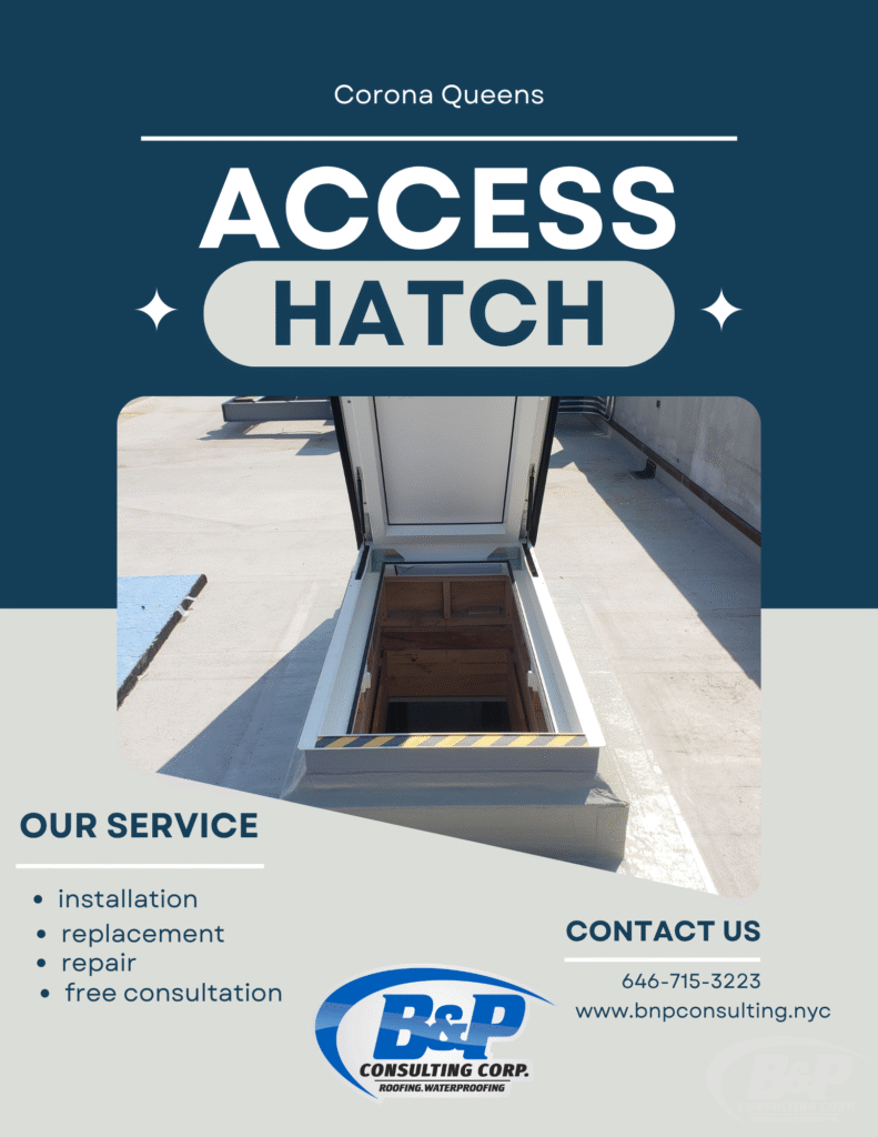 Accessing your rooftop has never been easier with roof access hatch installation services from B&P Consulting Corp. in Corona. Whether you need easy access for maintenance, emergency egress, or simply to enjoy the view, our custom roof access hatches are designed to be durableweather-resistant, and aesthetic. We ensure each installation fits seamlessly into your property’s design, providing you with secure and reliable rooftop access.