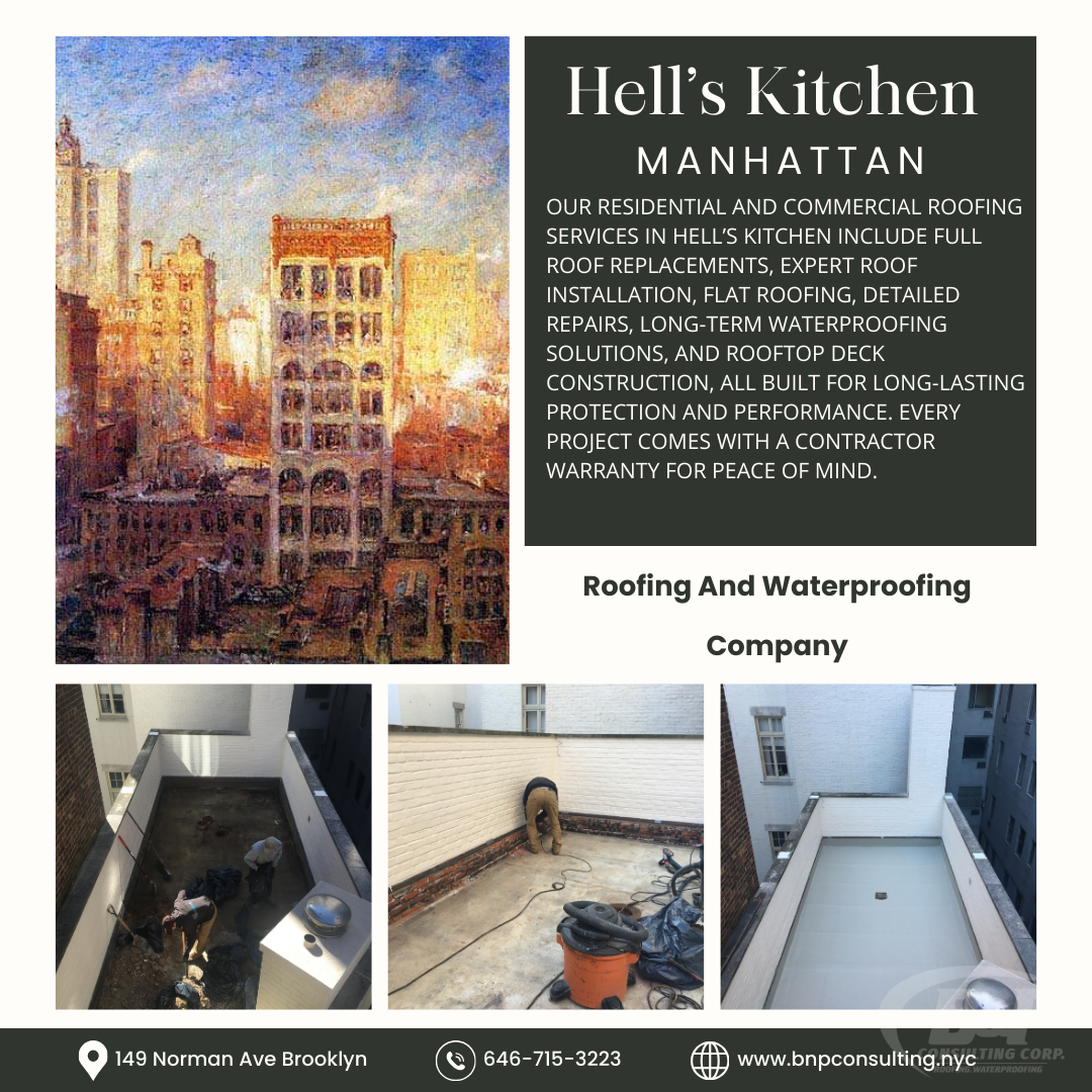 Protecting your property in Hell’s Kitchen, Manhattan requires roofing systems built to withstand the unique challenges of this vibrant, historic, and densely developed neighborhood. B&P Consulting Corp is a trusted Hell’s Kitchen Manhattan roofing company, providing expert commercial and residential roofing services, brownstone and townhouse roofing services, flat roofing, roof installation, rooftop deck construction, and advanced waterproofing solutions, all backed by a contractor warranty.