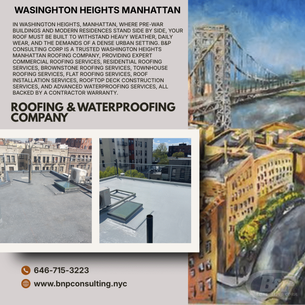 In Washington Heights, Manhattan, where pre-war buildings and modern residences stand side by side, your roof must be built to withstand heavy weather, daily wear, and the demands of a dense urban setting. B&P Consulting Corp is a trusted Washington Heights Manhattan roofing company, providing expert commercial roofing services, residential roofing services, brownstone roofing services, townhouse roofing services, flat roofing services, roof installation services, rooftop deck construction services, and advanced waterproofing services, all backed by a contractor warranty.