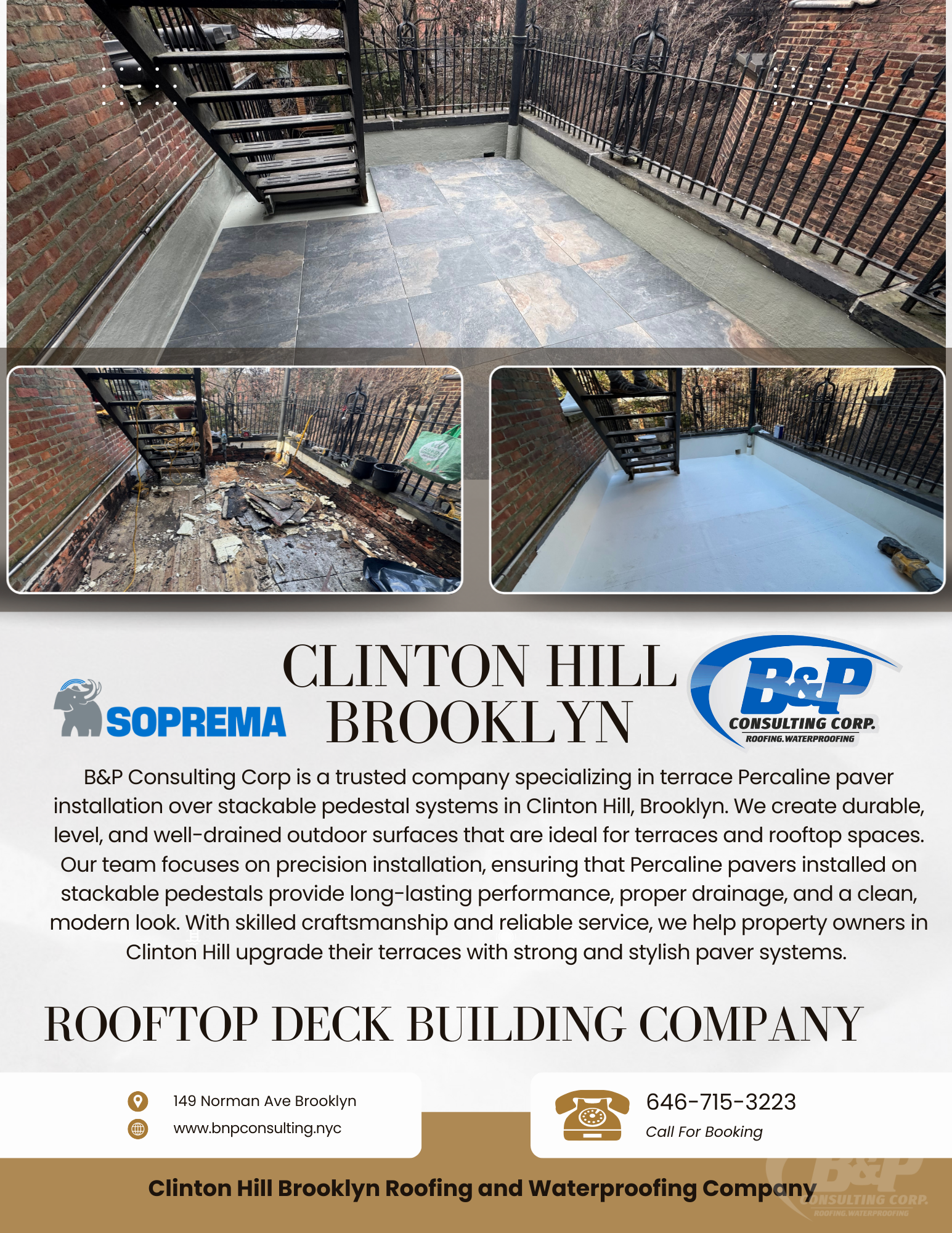Amid the historic brownstones and elegant architecture of Clinton Hill Brooklyn, where preserved row houses and tree shaded streets create timeless appeal, flat roofs must withstand classic NYC challenges including ponding water from uneven slopes, freeze thaw stress on aging membranes, humidity buildup, and the need to maintain architectural integrity. B&P Consulting Corp is the trusted Clinton Hill Brooklyn Flat Roofing Company providing expert Commercial and Residential Roofing, professional Waterproofing Services, and complete exterior protection for NYC townhouses, brownstones, mixed use buildings, and properties throughout New York City. We install premium Soprema Liquid Roofing Materials and Siplast PMMA Roofing Systems, advanced seamless high performance membranes engineered to eliminate leaks, accommodate thermal expansion and contraction, resist UV exposure and weather wear, and deliver long term Roof Waterproofing while preserving the neighborhood’s historic character. Our services include Flat Roof Replacement, Flat Roof Repair, Commercial Roofing, Residential Roofing, and comprehensive Building Waterproofing Solutions that address underlying issues for permanent results. We also provide Skylight Installation and Waterproofing, Gutter Installation and Waterproofing, Roof Access Hatch Installation and Repair, and Terrace Waterproofing to protect interiors and outdoor spaces year round. Every project begins with a detailed and transparent roof evaluation to ensure clarity, confidence, and informed decision making. We provide skilled workmanship and dependable service on every job. All work is backed by a strong Contractor Warranty for lasting protection and peace of mind. Clinton Hill Brooklyn Roofing and Waterproofing Experts rely on B&P Consulting Corp to preserve and protect their properties with heritage respecting roofing solutions. Free estimates available. Call 646-715-3223 today for professional roofing and waterproofing built to protect your Clinton Hill property for years to come.