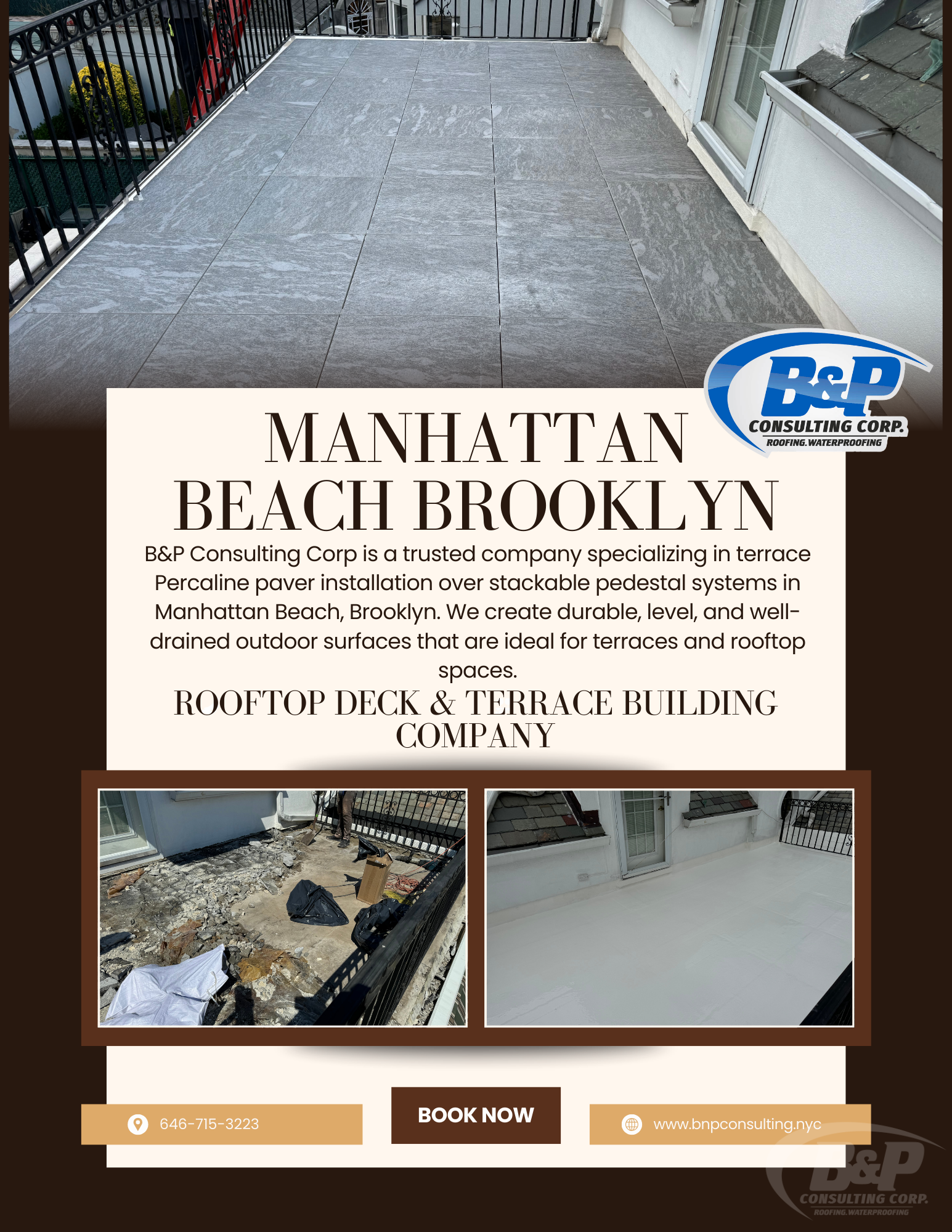 When it comes to protecting your property in Manhattan Beach Brooklyn, your roof is a critical barrier against the harsh conditions of New York City weatherB&P Consulting Corp is the trusted Manhattan Beach Brooklyn Flat Roofing Companyproviding expert Commercial and Residential Roofing, professional Waterproofing Services, and complete exterior protection for NYC townhouses, homes, and mixed use buildings throughout New York City As a skilled flat roofing company, we specialize in durable, leak resistant roofing systems for NYC properties. We install premium Soprema Liquid Roofing Materials and Siplast PMMA Roofing Systems, seamless waterproof membranes engineered to prevent leaks, resist ponding, and deliver long term Roof Waterproofing performance Our services include Flat Roof Replacement, Flat Roof Repair, Commercial Roofing, Residential Roofing, and comprehensive Building Waterproofing Solutions for lasting protection. We also provide Skylight Installation and Waterproofing, Gutter Installation and Waterproofing, Roof Access Hatch Installation and Repair, and Terrace Waterproofing to safeguard interiors and outdoor areas Every project begins with a thorough roof inspection and clear recommendations. All work is completed with expert craftsmanship and backed by a strong Contractor Warranty for reliable long term protection Manhattan Beach Brooklyn Roofing and Waterproofing Experts rely on B&P Consulting Corp for professional, durable, and dependable roofing solutions Free estimates available. Call 646-715-3223 today to protect your Manhattan Beach property with expert roofing and waterproofing built to last