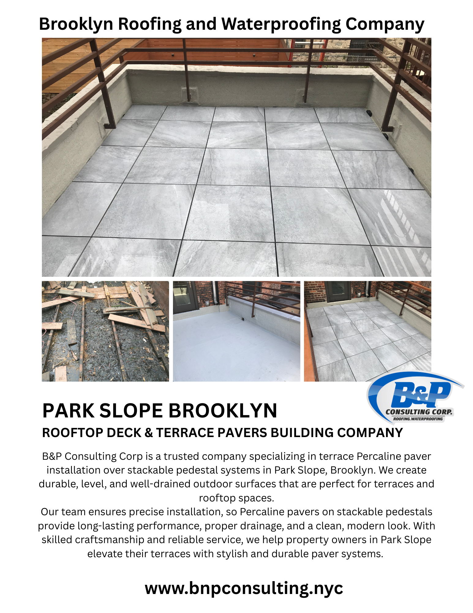 increasingly feature rooftop terraces and decks as cherished outdoor retreats, but improper installation can lead to membrane punctures, ponding, leaks, drainage failures, and structural overload on historic flat roofs. B&P Consulting Corp is your trusted rooftop pavers installation company in Brooklyn, New York, specializing in leak-proof elevated rooftop deck construction for brownstones. With proven experience, we handle complete services including: Rooftop pavers installation and rooftop deck constructionPorcelain pavers, concrete pavers, and Ipe wood paversStackable and adjustable pedestals for perfectly level, free-draining surfacesSetback roof pavers installation to maintain proper drainage slopes, setbacks, and roof membrane protectionWe integrate pedestal-supported systems with underlying waterproofing, compatible with Soprema Liquid Applied Roofing Materials when needed, to create a protected, ventilated assembly that prevents water intrusion, accommodates roof movement, resists freeze-thaw cycles and pedestrian wear, and supports safe beautiful outdoor living without compromising the flat roof. Every installation includes our contractor warranty, precise load assessments for brownstone roofs, and full compliance with NYC building codes and historic preservation standards. We begin with a comprehensive site evaluation and clear project plan, transforming your rooftop into a secure, functional, and stunning extension of your home. Brooklyn, New York brownstone owners choose B&P Consulting Corp for professional rooftop pavers and deck solutions.Free estimates available.Call 646 715 3223 today to build your dream rooftop oasis with expert installation.
