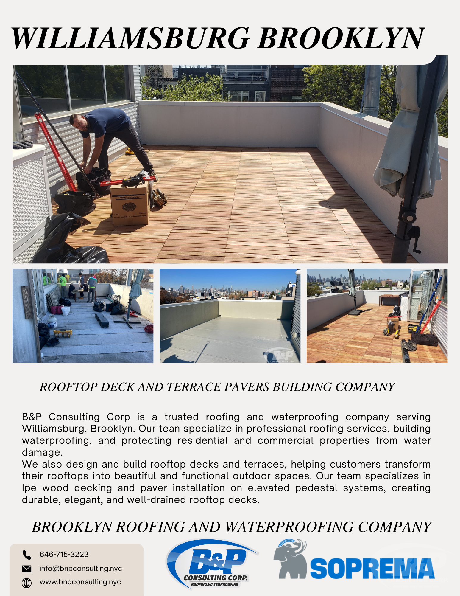 When it comes to protecting your property in Williamsburg, Brooklyn, your roof is your building’s first line of defense against the demanding weather conditions of New York City. B&P Consulting Corp is a trusted Williamsburg Brooklyn roofing company specializing in advanced roofing and waterproofing systems designed specifically for NYC properties. We are experts in brownstones and townhouse building, providing durable, high-performance solutions that come with a contractor warranty. We also offer commercial roofing and waterproofing for businesses and multi-family properties. As an experienced flat roofing company, we understand the structural and environmental demands placed on NYC townhouses and residential buildings. Flat roofs in Brooklyn are exposed to constant rain, snow, temperature shifts, and foot traffic. That’s why we install premium systems like Soprema Liquid Roofing Materials and Siplast PMMA roofing systems, creating seamless, fully adhered waterproof membranes built to stop leaks, resist ponding water, and extend roof lifespan. We provide complete residential and commercial roofing services throughout Williamsburg, including full roof replacements, detailed repairs, long-term waterproofing solutions, skylight installation and repair, gutter installation and repair, roof access hatch installation and repair, and terrace/rooftop deck building/waterproofing. Every project begins with a thorough evaluation and a clear plan so you understand exactly what your property needs. Free estimates available. Call 646-715-3223 today to work with B&P Consulting Corp for expert roofing, waterproofing, and brownstone or townhouse building services in Williamsburg, Brooklyn.