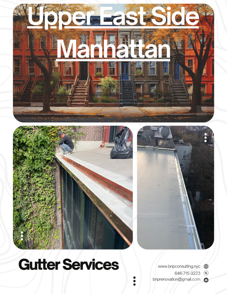 In the Upper East Side, where the refined architectural character of brownstones and stately apartment buildings define the neighborhood, maintaining your flat roof gutters is essential for preserving your property’s value and aesthetic. B&P Consulting Corp. offers expert flat roof gutter installationflat roof gutter replacement, and flat roof gutter repair services. Whether you’re updating your existing gutters, replacing worn-out systems, or fixing leaks, we provide durable, high-quality solutions that protect your home from water damage. Trust us to ensure your Upper East Side gutters work seamlessly, so you can enjoy peace of mind during the city’s ever-changing weather.