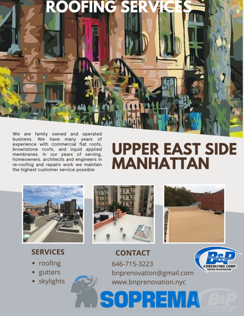 When it comes to finding a reliable, top-rated roofing company in the Upper East SideB&P Consulting Corp. is the name to trust. From roof inspections to installations, repairs, and maintenance, we offer expert services that are specifically designed to meet the needs of Upper East Side properties. Our skilled team delivers high-quality craftsmanship and exceptional customer service, ensuring your roof stays in prime condition year-round. Reach out today at 646-715-3223 for a free consultation and see why we’re the go-to roofing experts for Upper East Side residents.