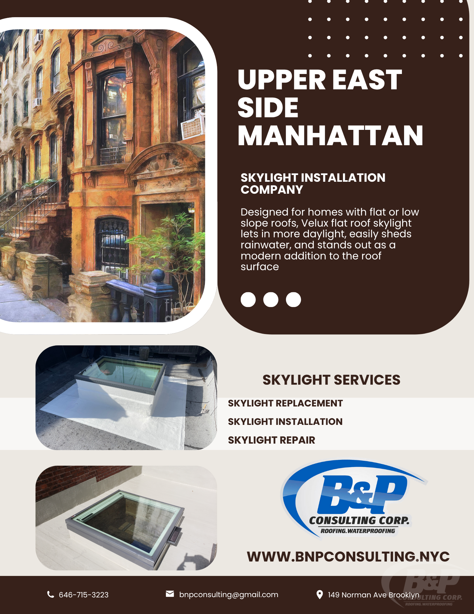In the Upper East Side, Manhattan, where sophisticated townhouses and luxury apartments grace tree-lined streets, a well-placed flat roof skylight can add natural light and elegance to your home. At B&P Consulting Corp., we specialize in flat roof skylight installationflat roof skylight repair, and flat roof skylight replacement. Whether you want to brighten up your classic pre-war apartment, restore a skylight that has seen better days, or replace an old fixture, we offer solutions that enhance the beauty and efficiency of your Upper East Side property. Let us bring the outdoors in, creating a space that’s as radiant as the neighborhood itself.